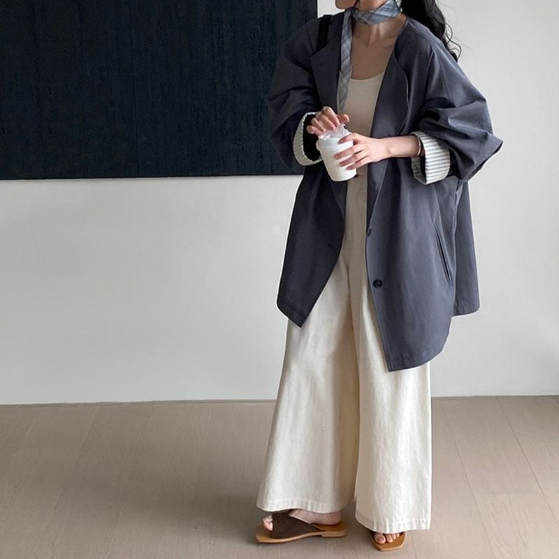 ドロップショルダーとノーカラーデザインが、リラックス感のある着こなしを叶えます。