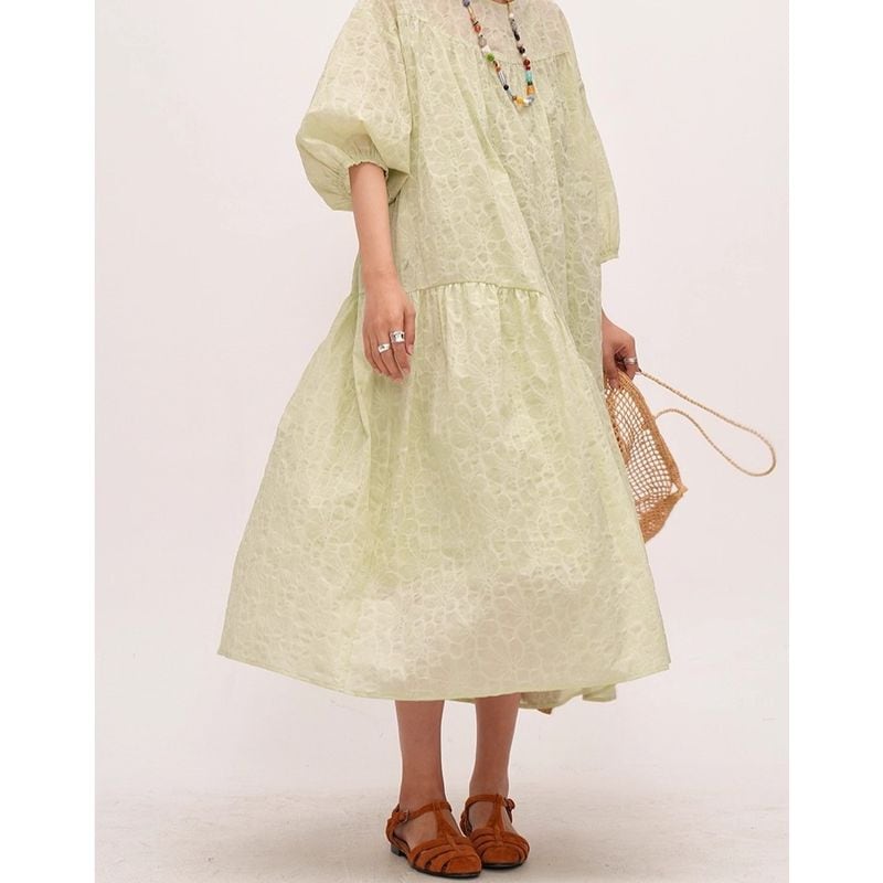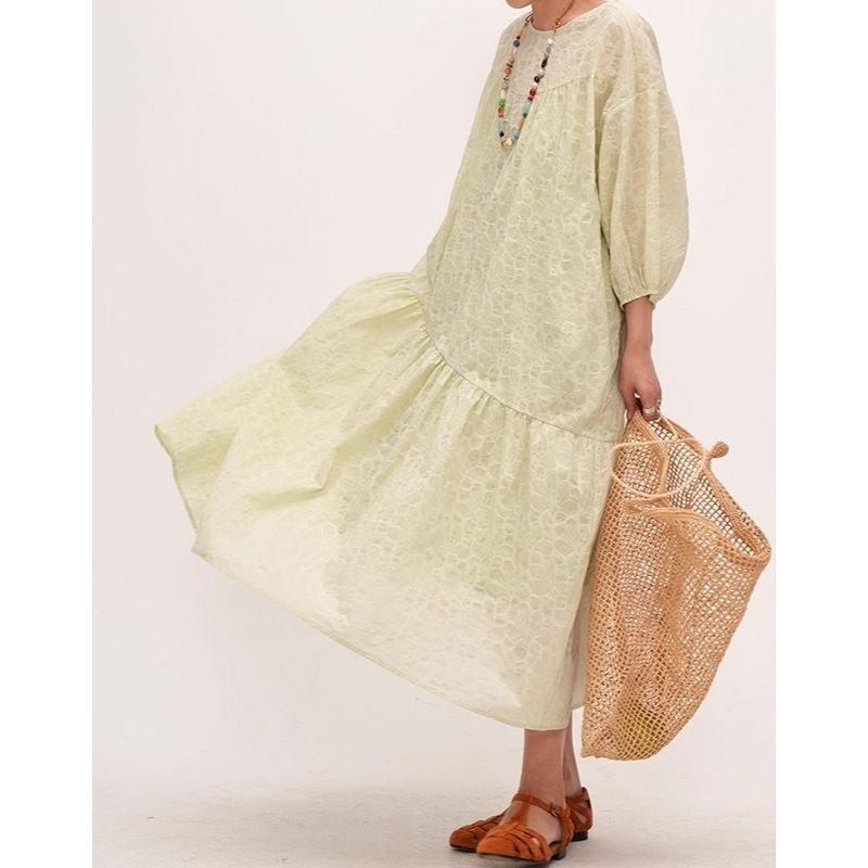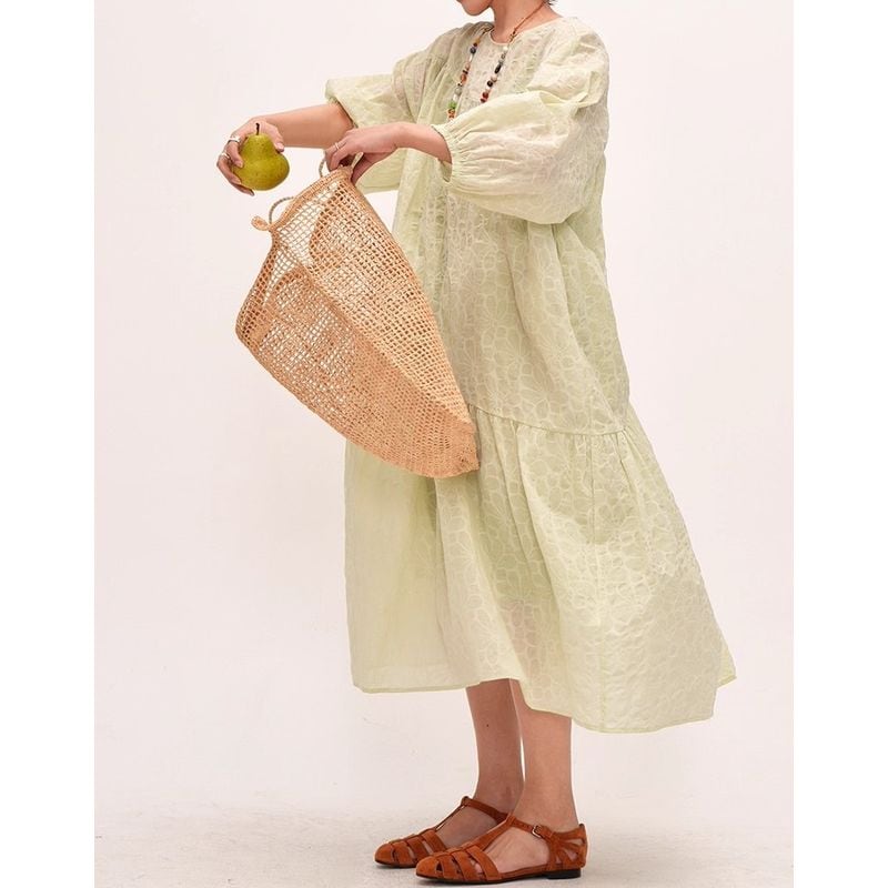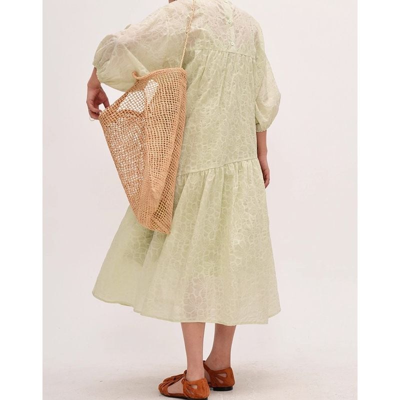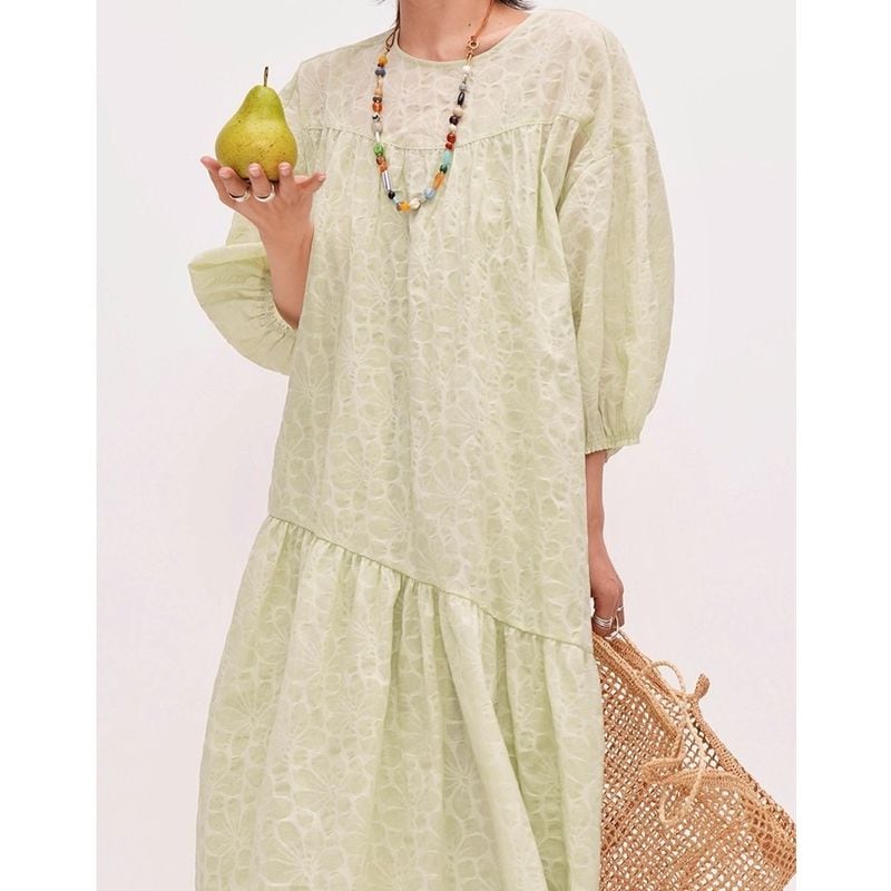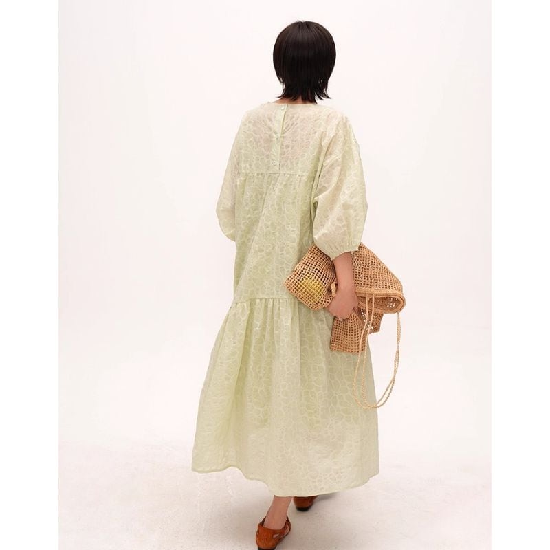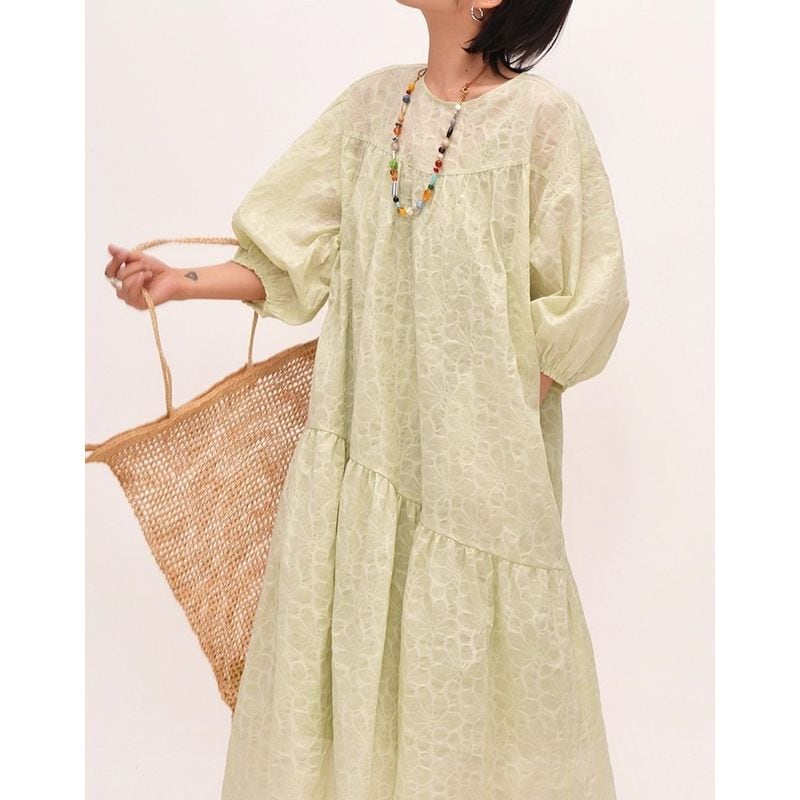 七分袖フラワー刺繍切替ギャザーワンピース 202136