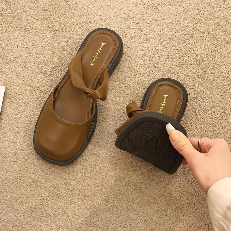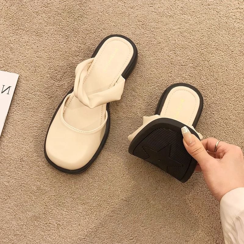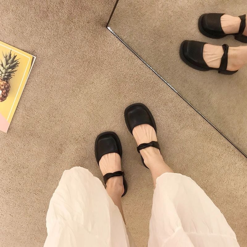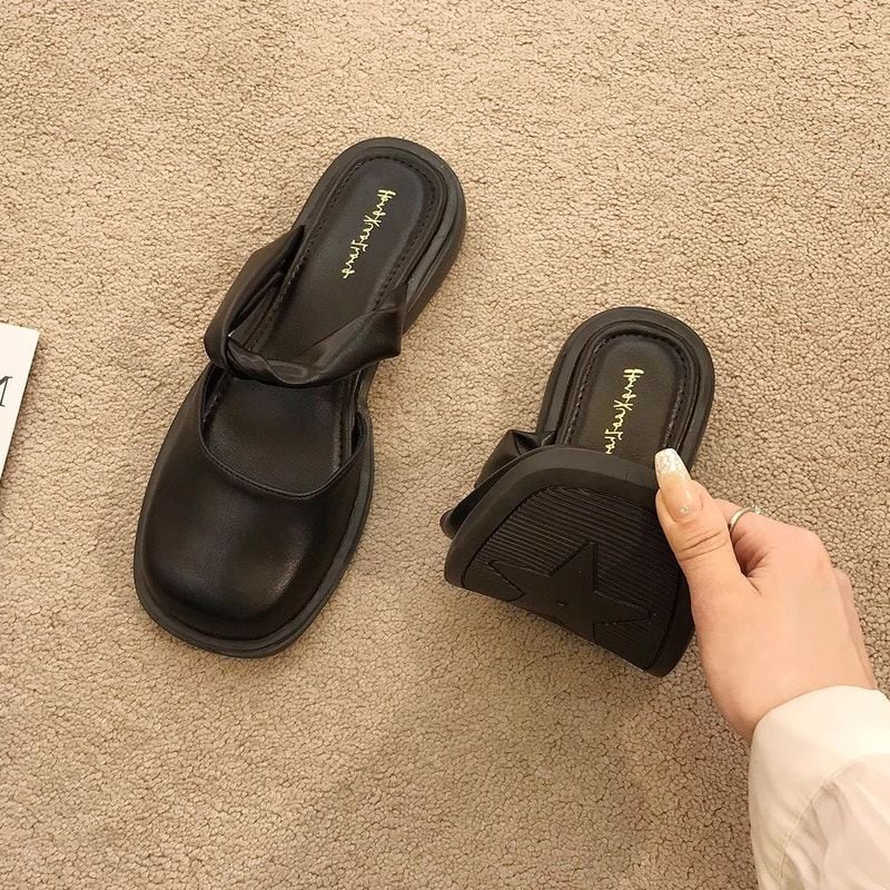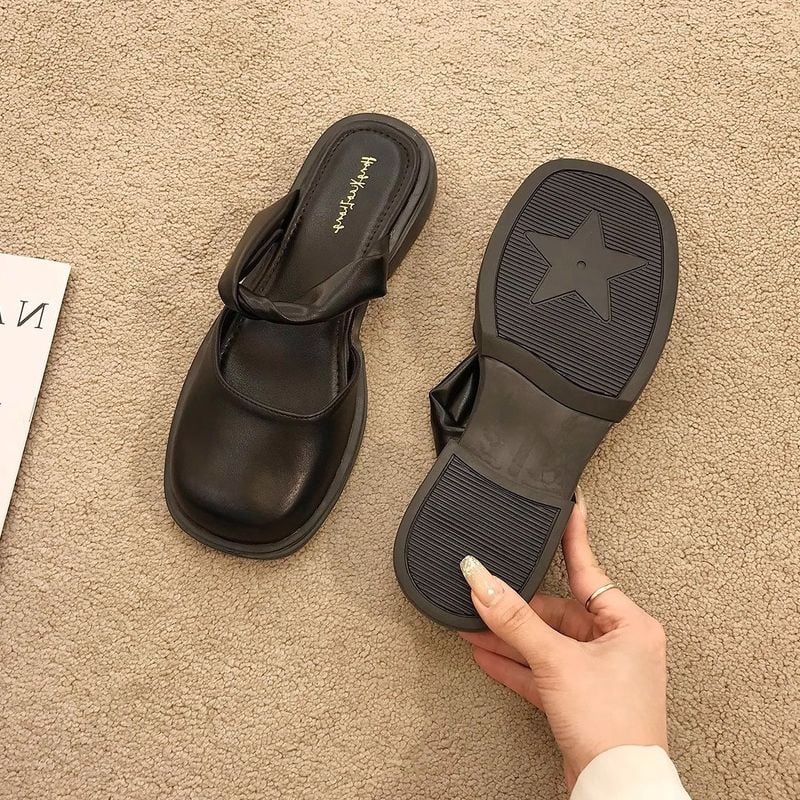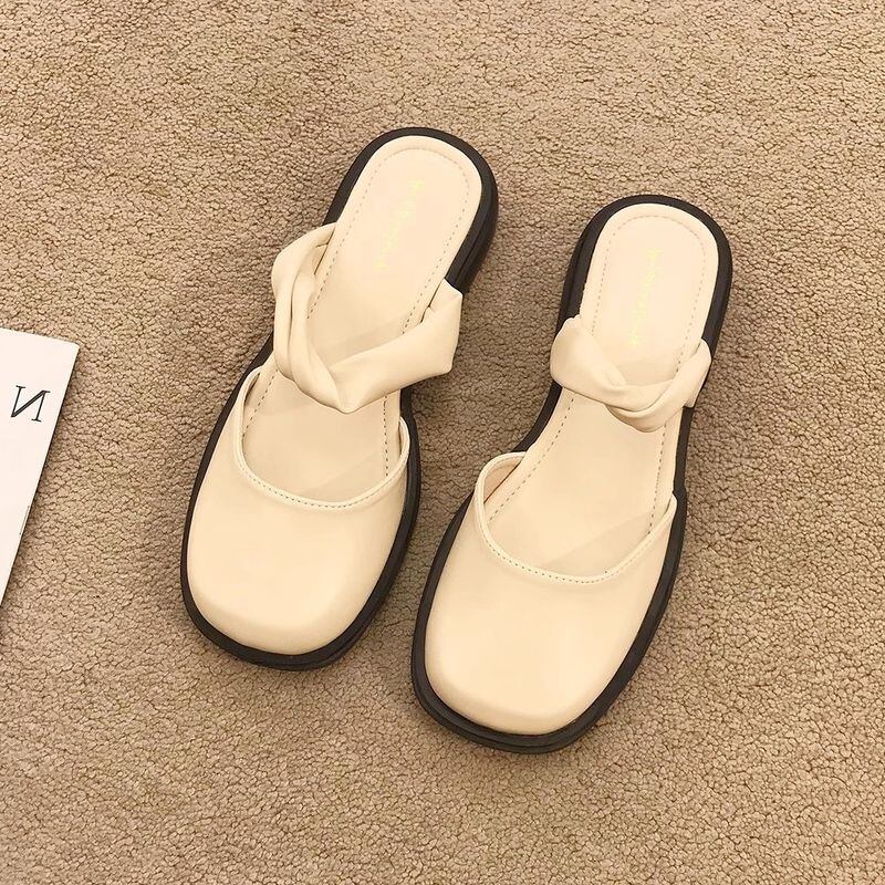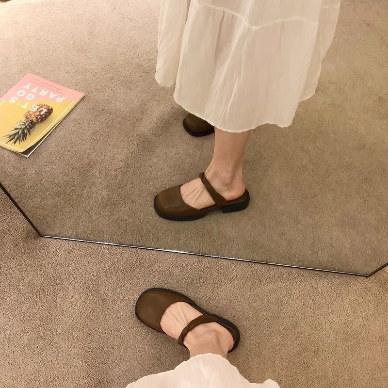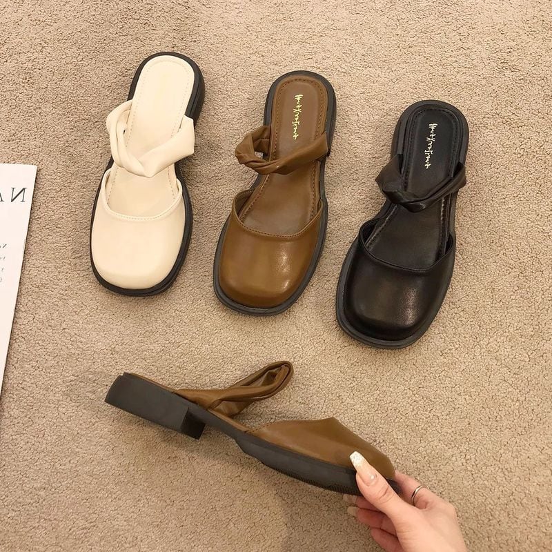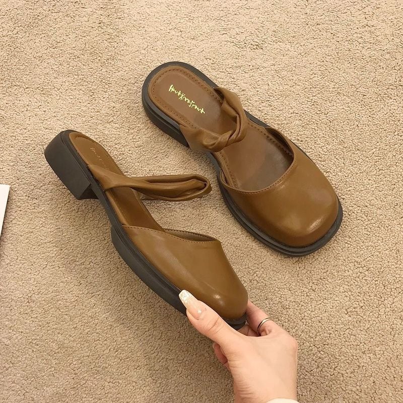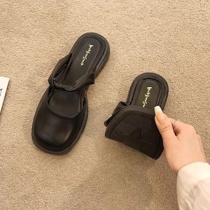 ローヒールとスクエアトゥが特徴のミュールパンプス。