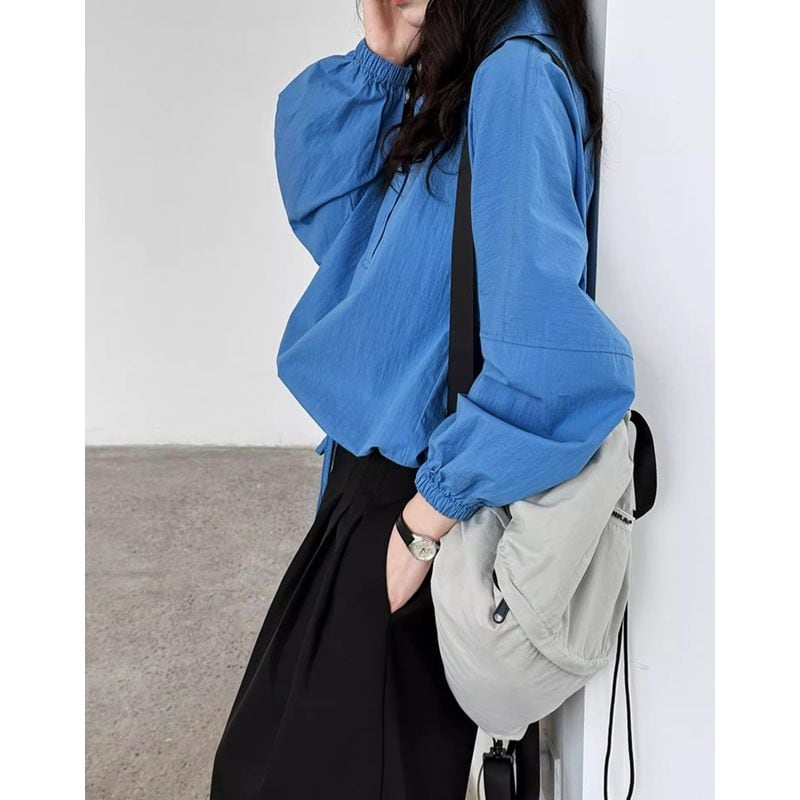 ハーフボタンと裾のドローストリングがポイントのシャツ。