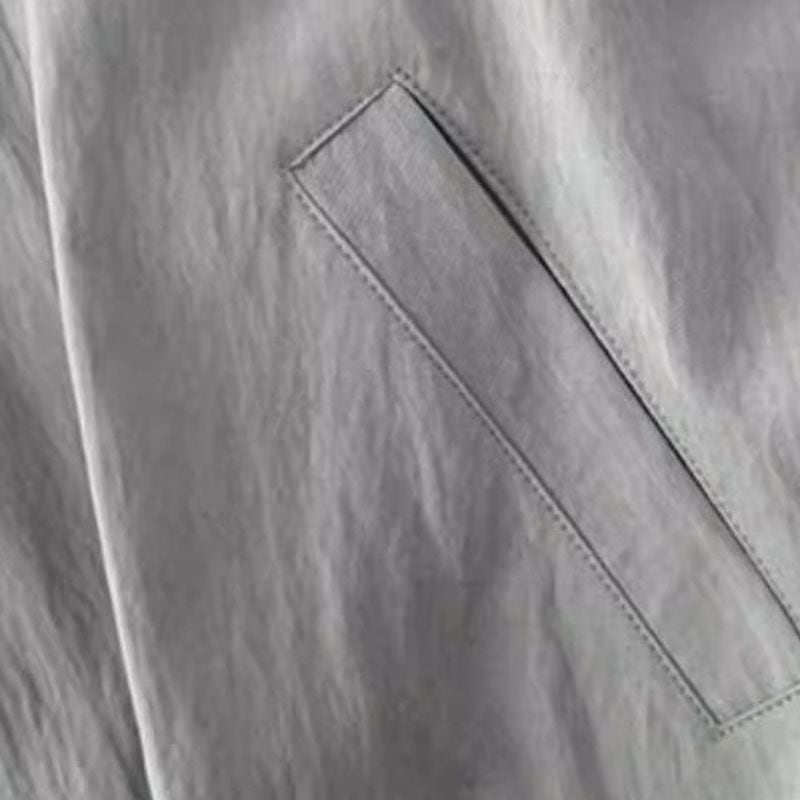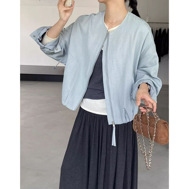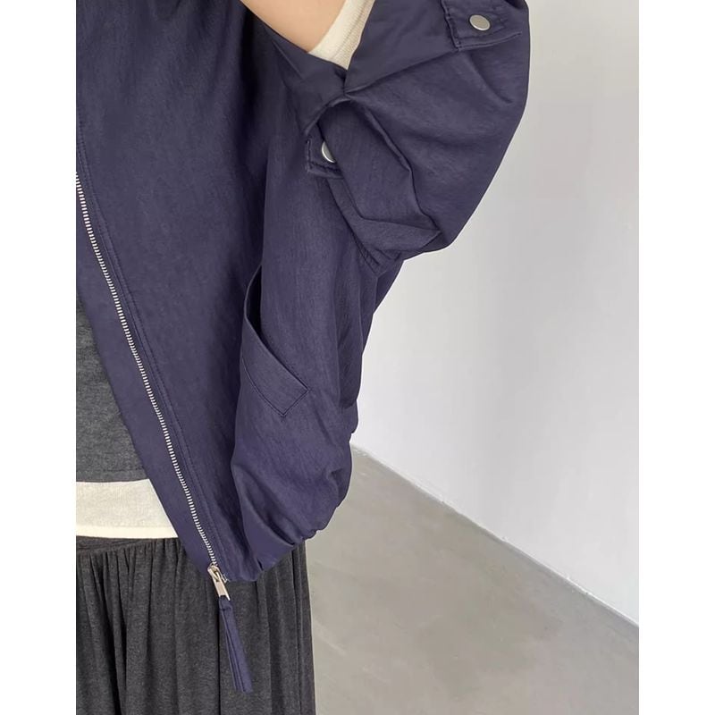 すっきりとしたノーカラーデザインと、程よくゆとりのあるドロップショルダーが魅力のブルゾン。
