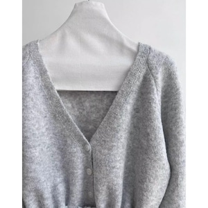 Vネックのすっきりとしたデザインと、ウエストをキュッと絞れるドローストリングがポイントのニットカーディガン。
