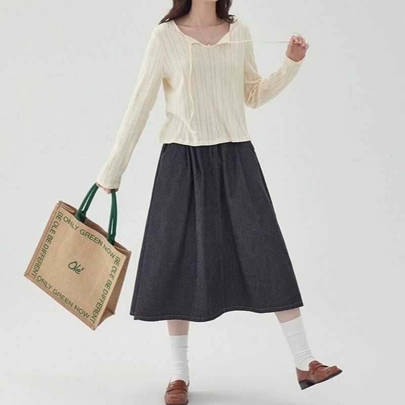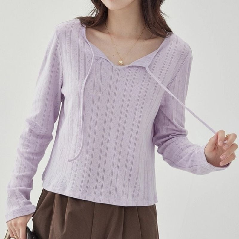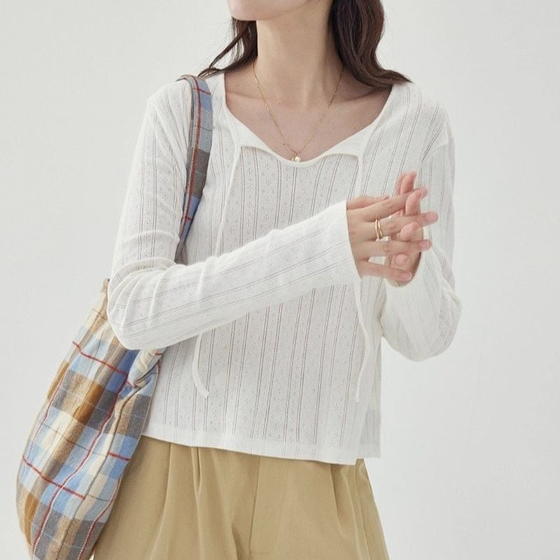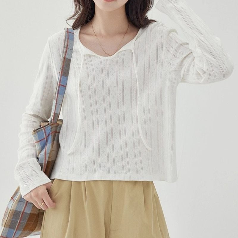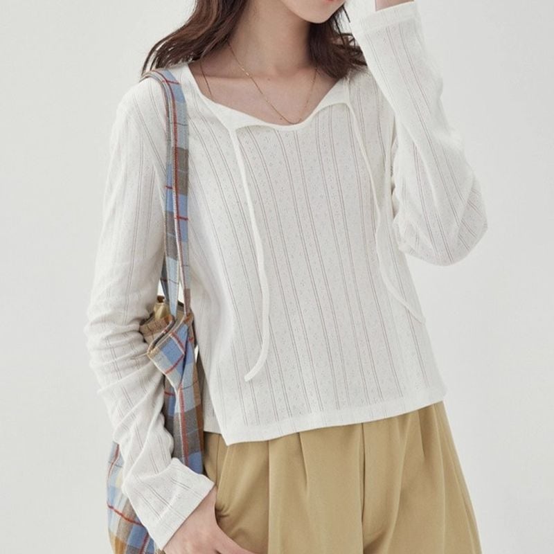 首元の紐は結んでアレンジしたり、垂らして抜け感を出すなど、スタイリングによって印象を変化させることができます。