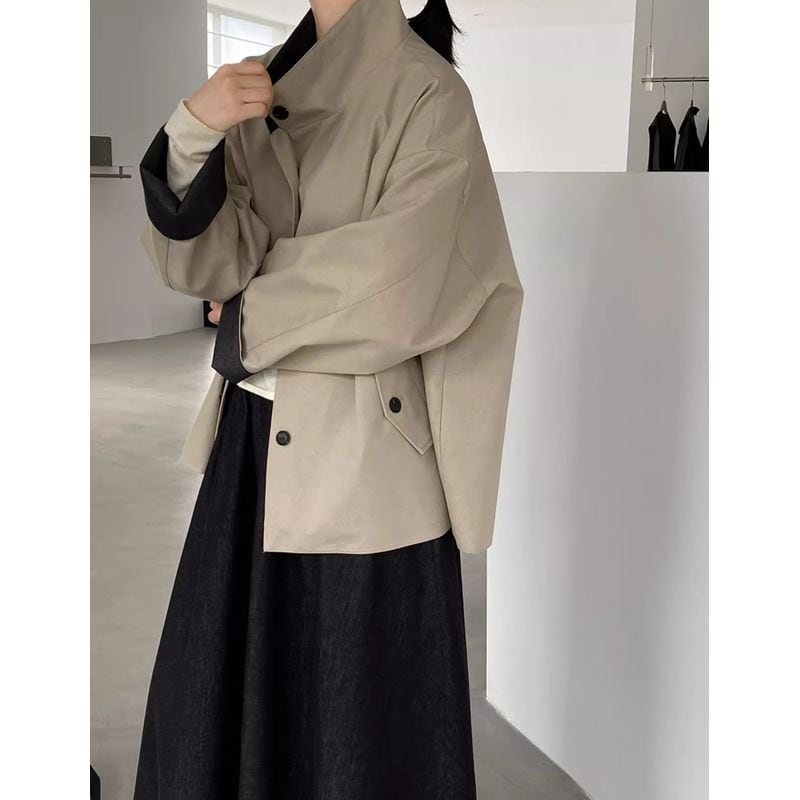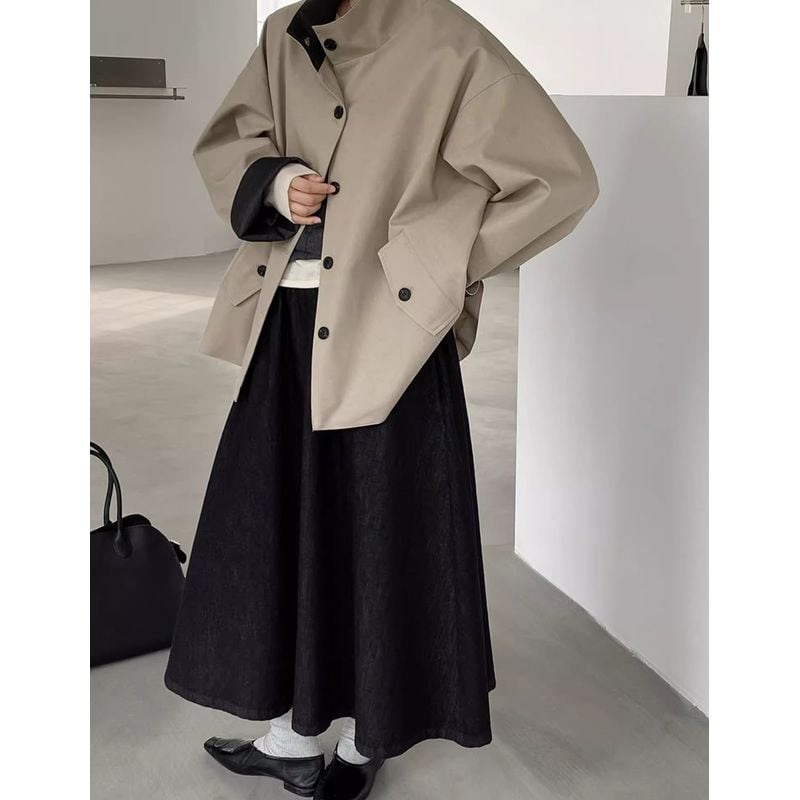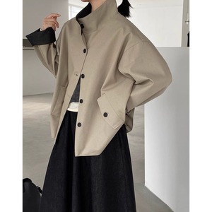 スタンドカラーとオーバーサイズのボックスシルエットが特徴的なジャケット。