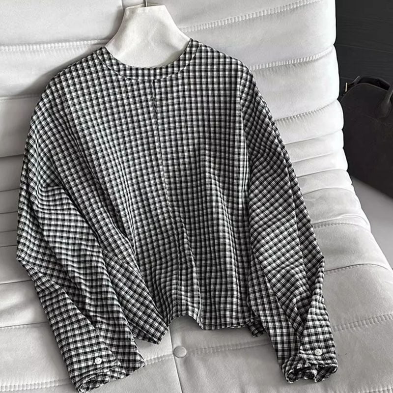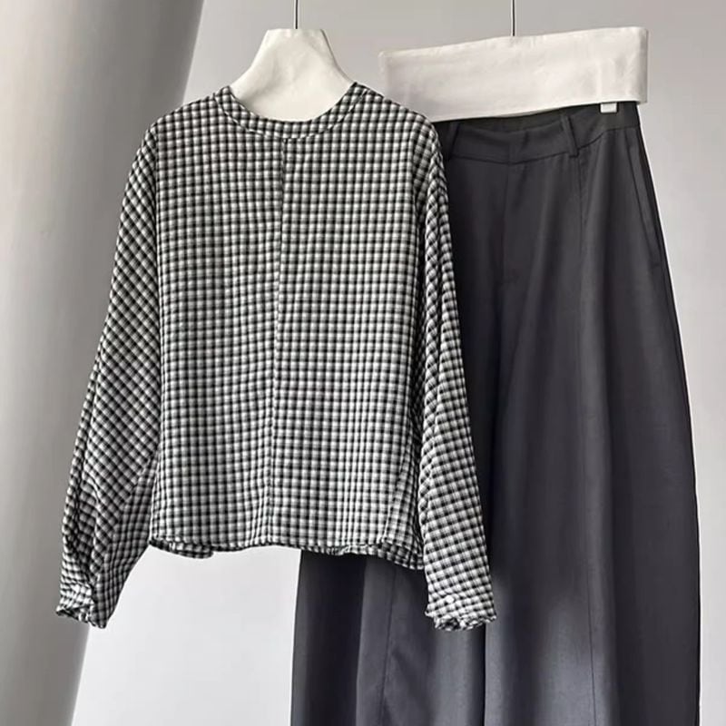 落ち着いたチェック柄とボリュームスリーブが、女性らしい柔らかな雰囲気を演出。