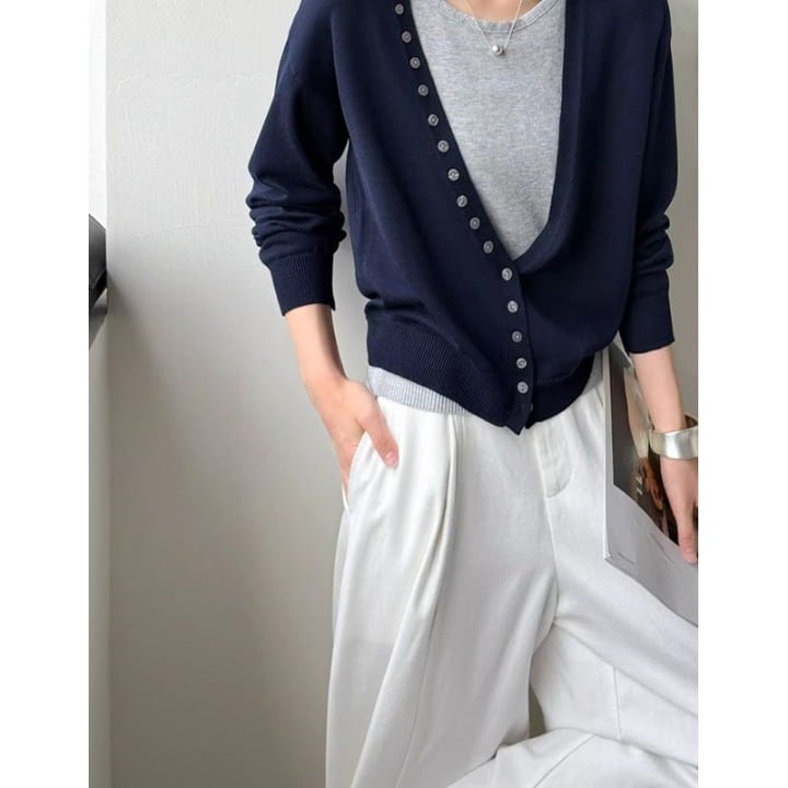 カーディガンは、ボタンを留めてきちんとスタイルにも、開けてリラックス感のあるスタイルにも対応できます。すっきりとしたシルエットのノースリーブは、カーディガンとのバランスが良く、様々なボトムスと好相性です。