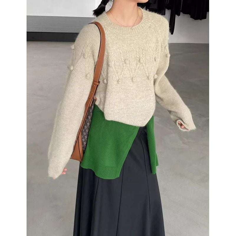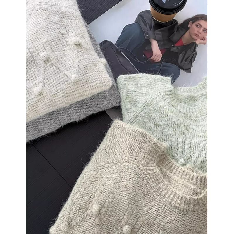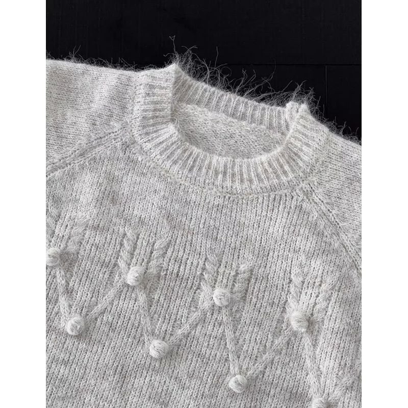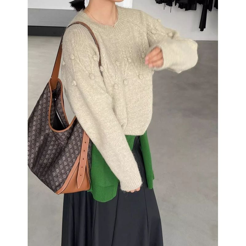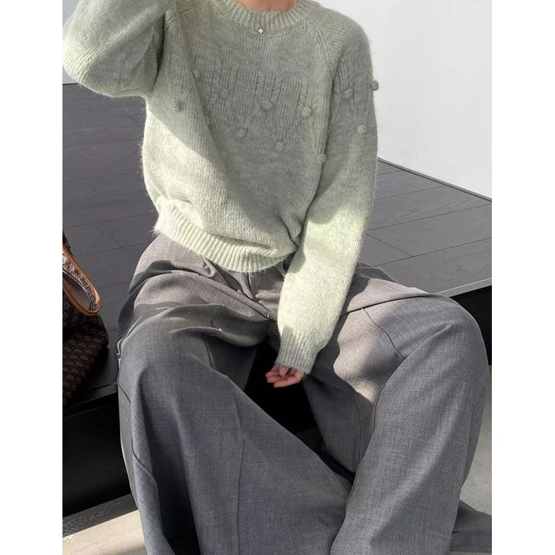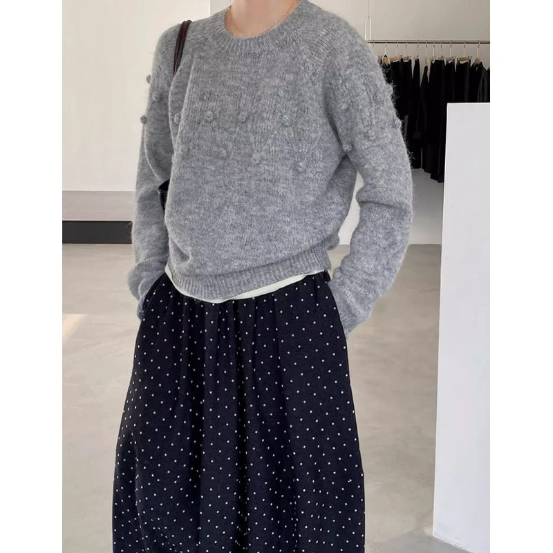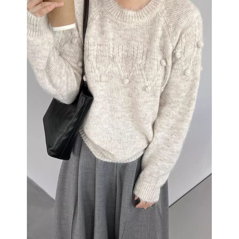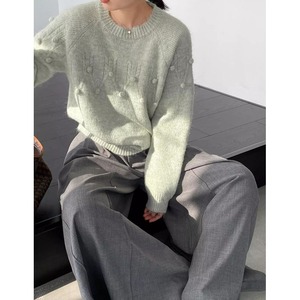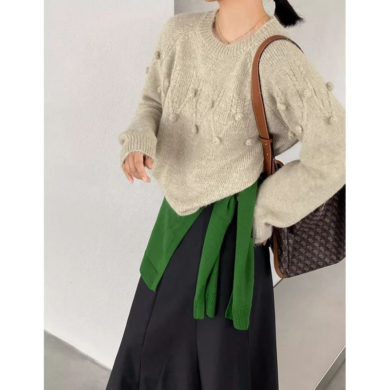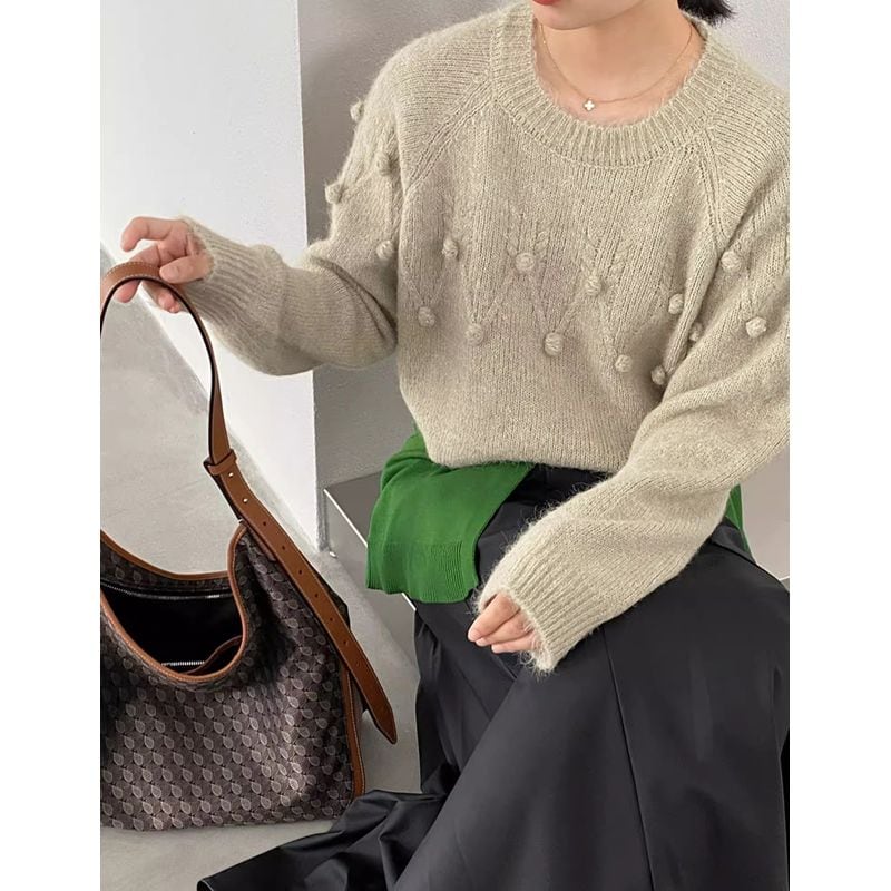 ポンポンが上品な可愛らしさを演出するクルーネックニット。
