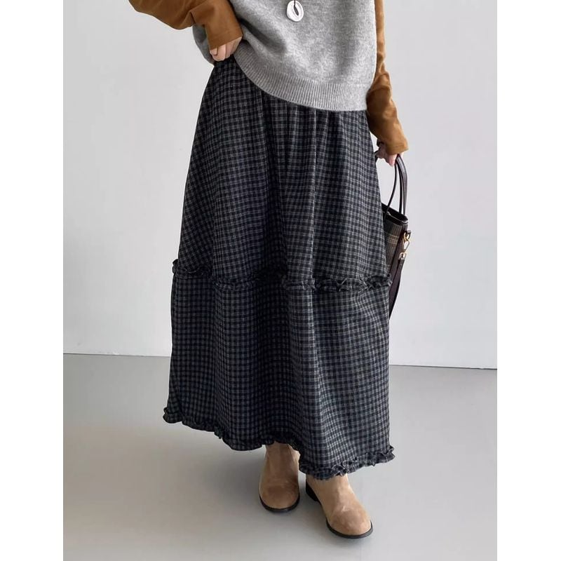 チェック柄フリルデザインフレアスカート 202207