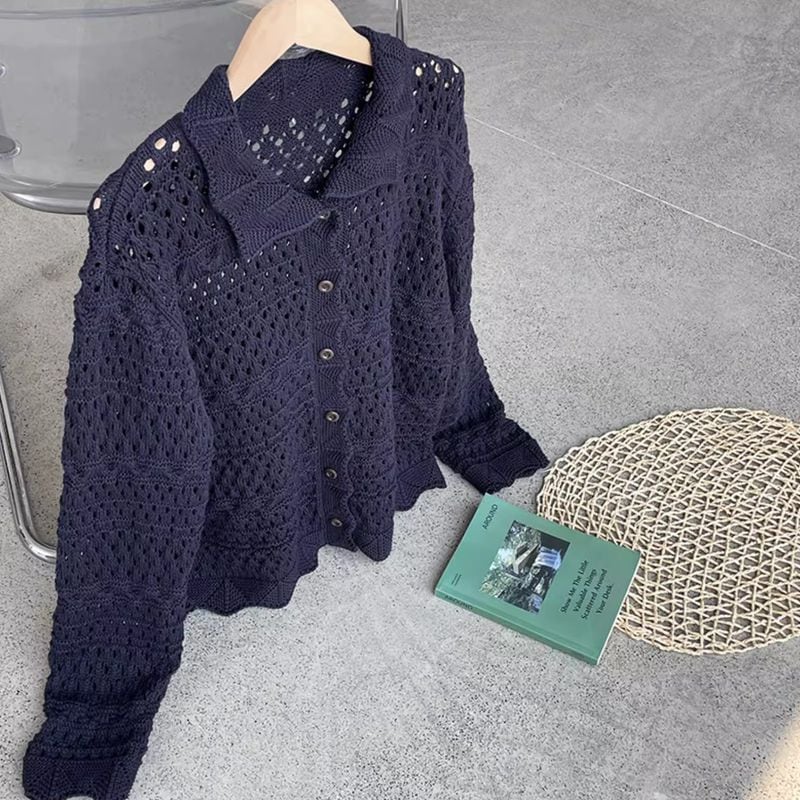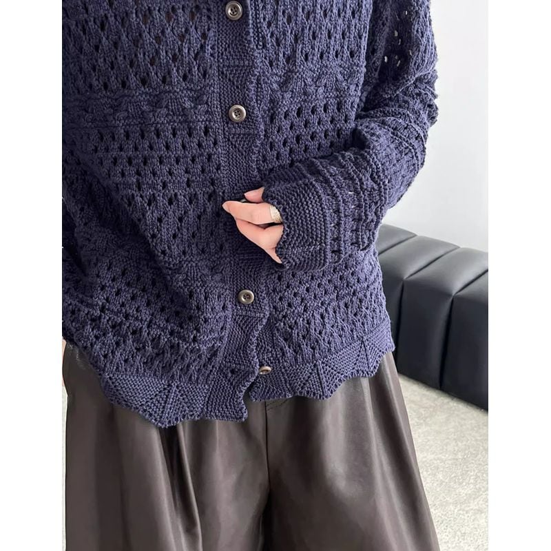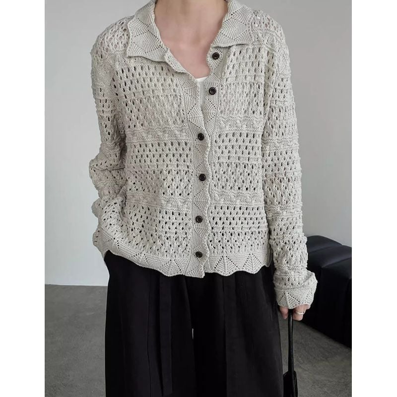 繊細な透かし編みが、スタイリングに抜け感をプラスするカーディガン。