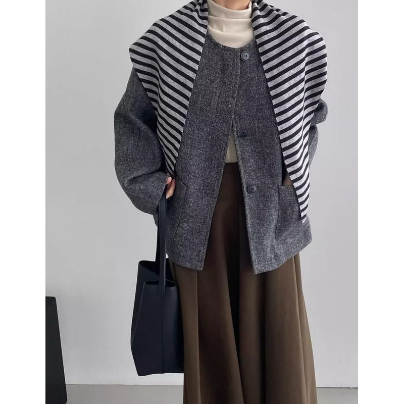 シンプルながらもドロップショルダーで抜け感をプラスしたノーカラージャケット。
