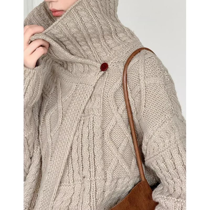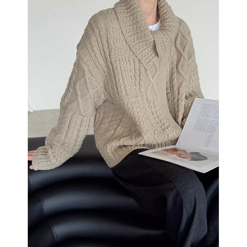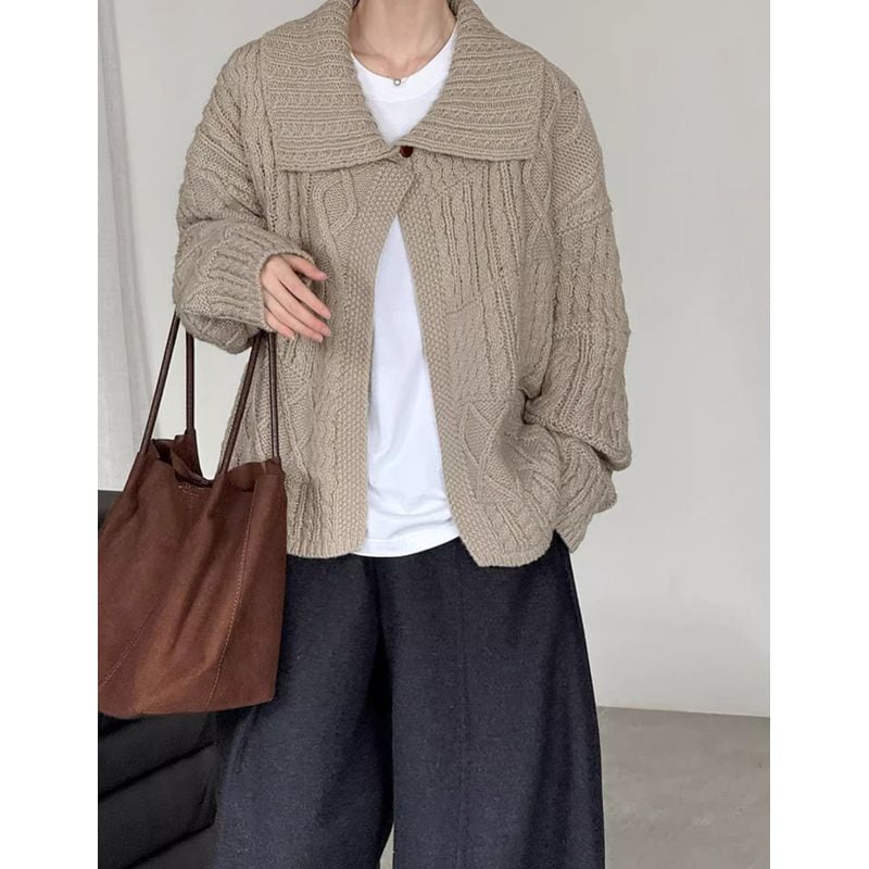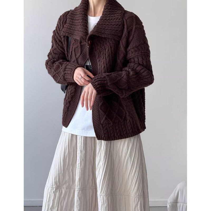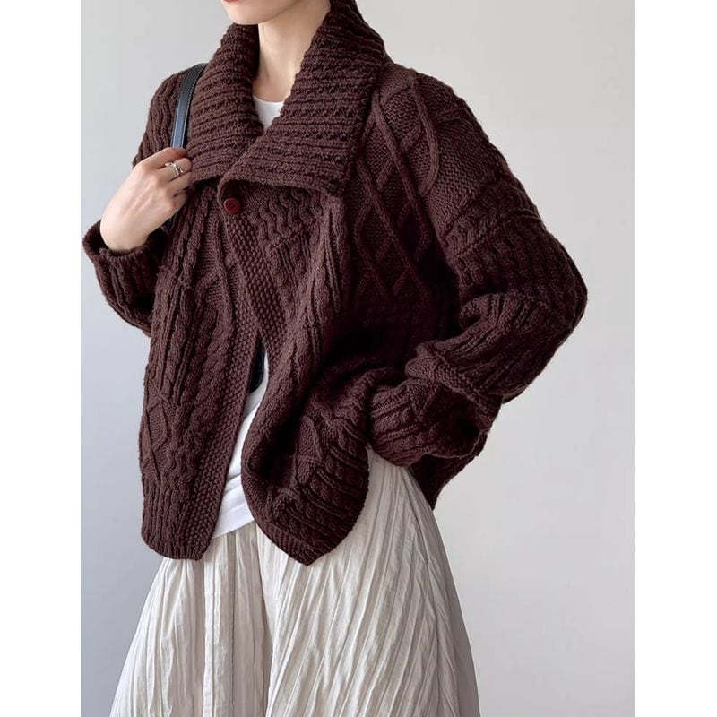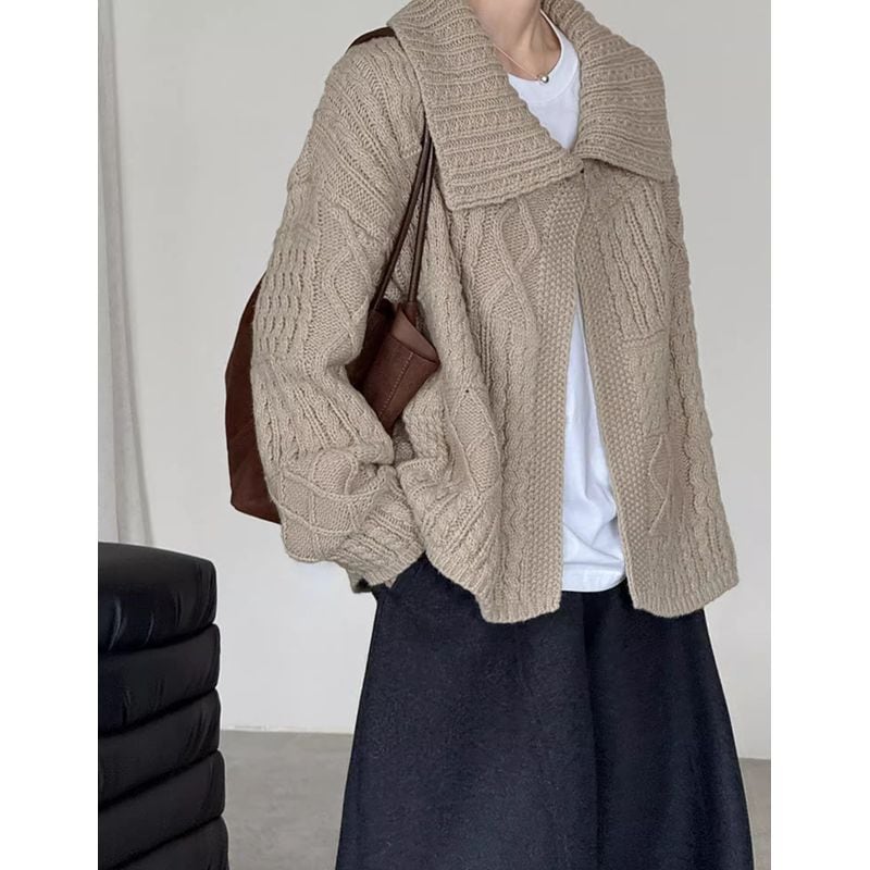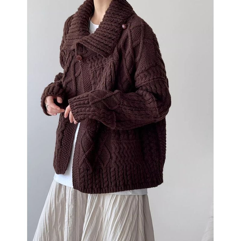 ショールカラーが首元を暖かく包み込むニットカーディガン。