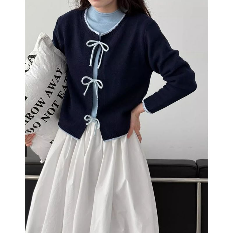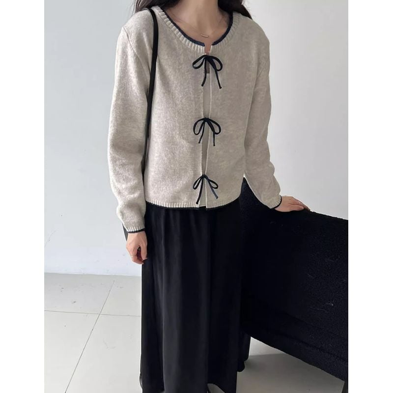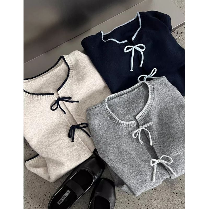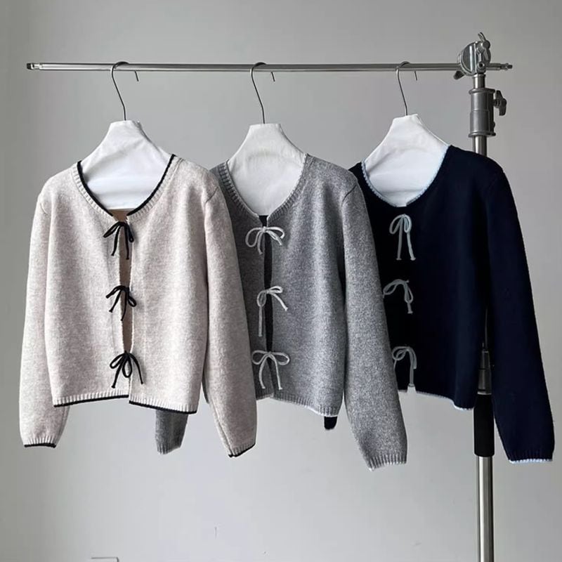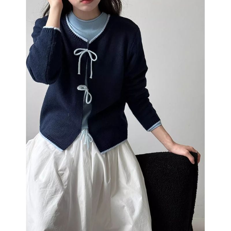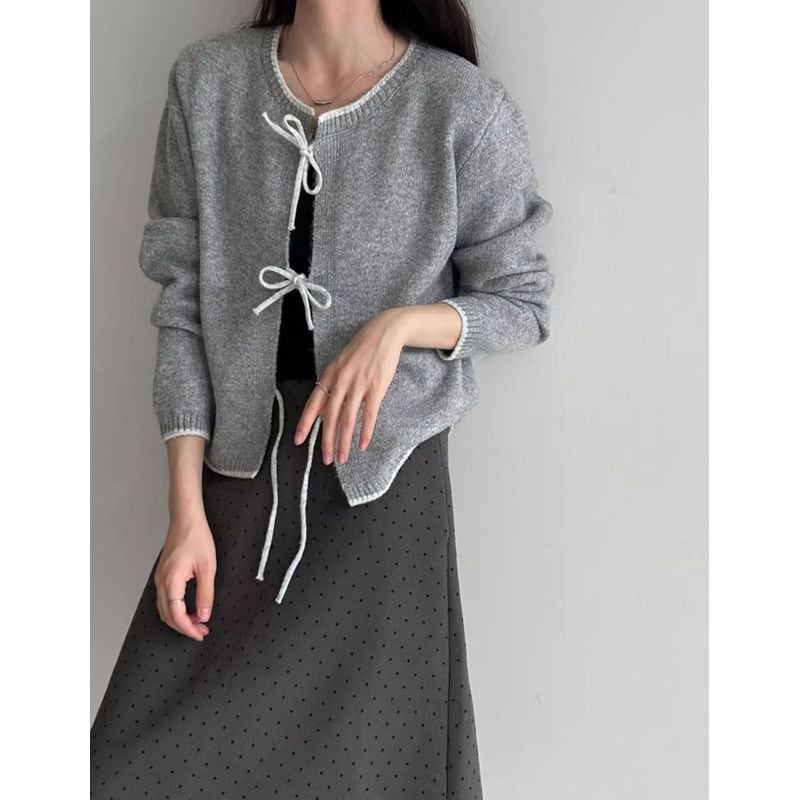 リボン付きバイカラーニットカーディガン 202227