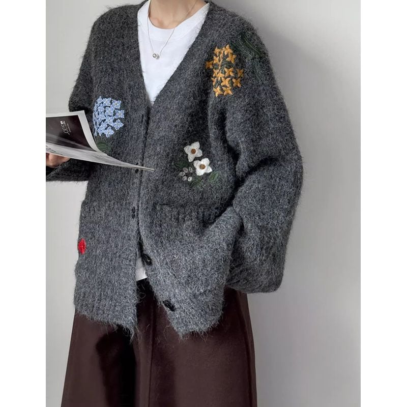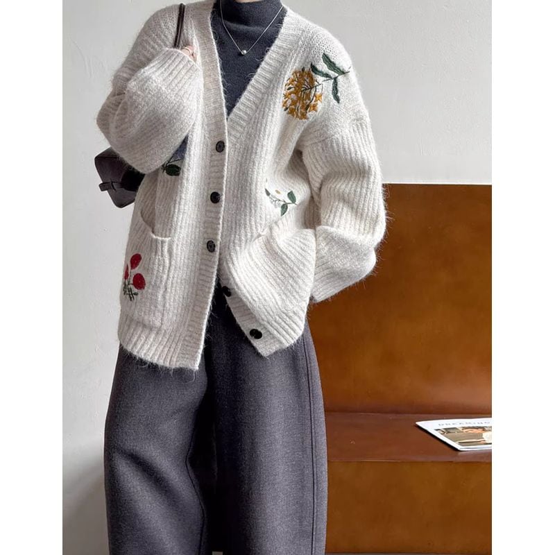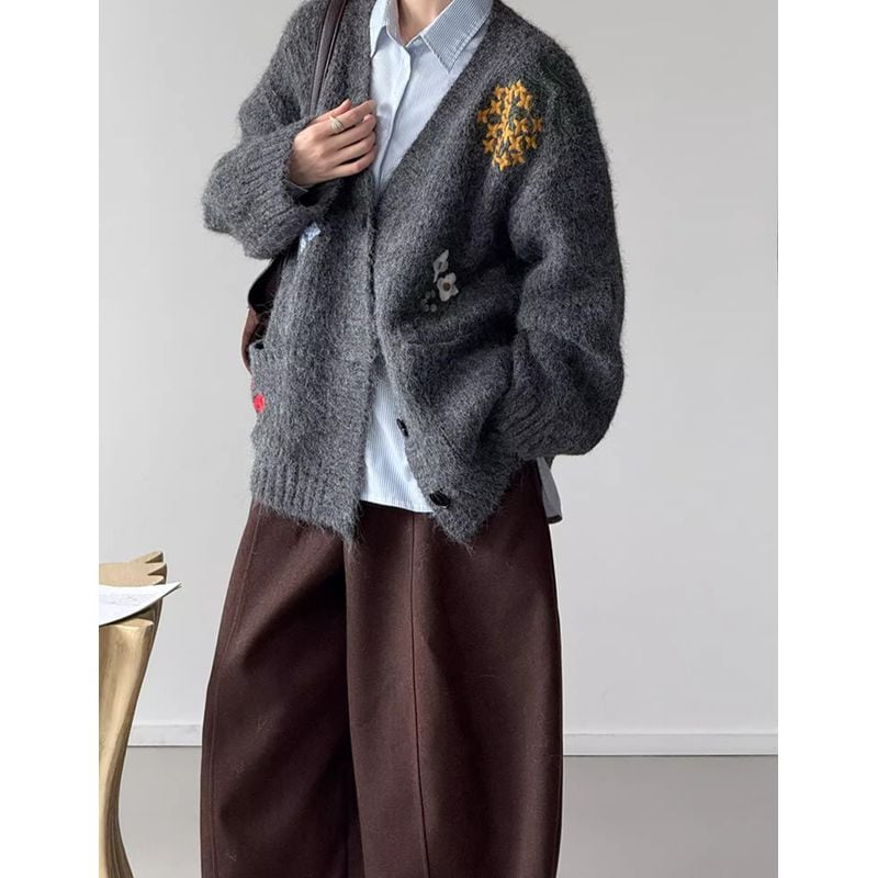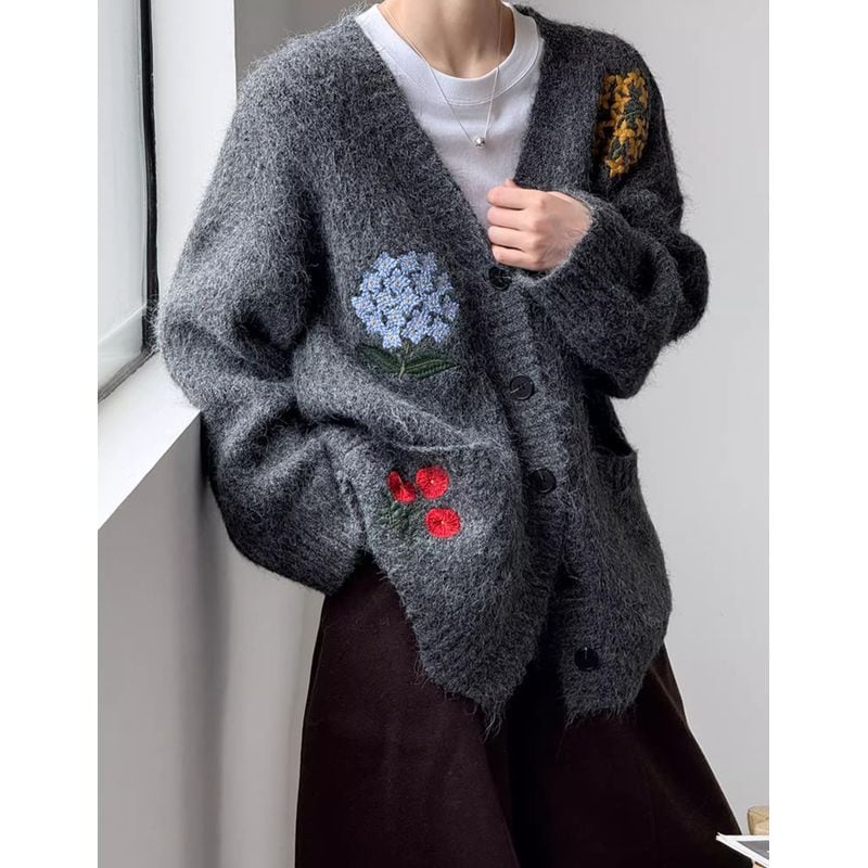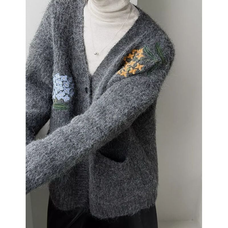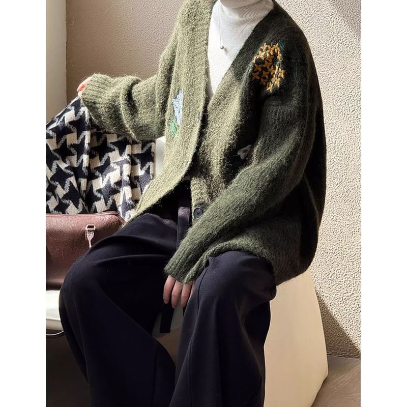 Vネックとオーバーサイズのシルエットが、抜け感を演出するカーディガン。