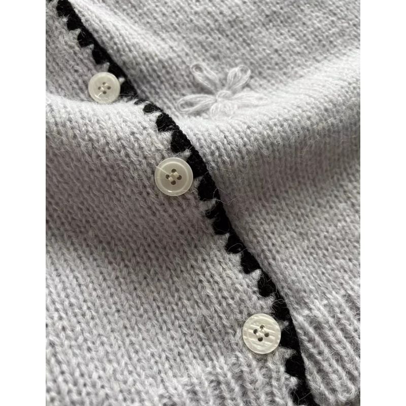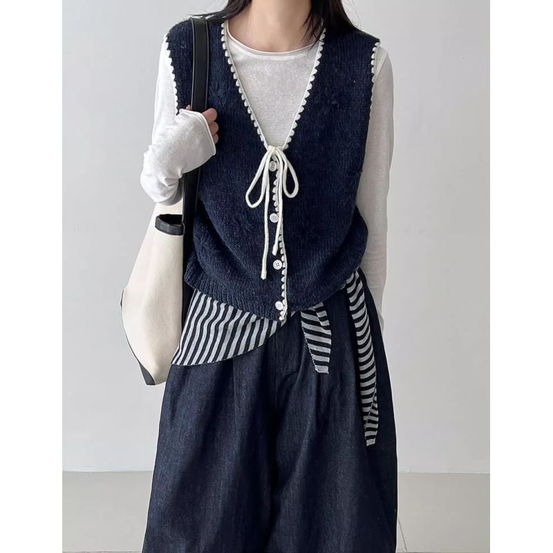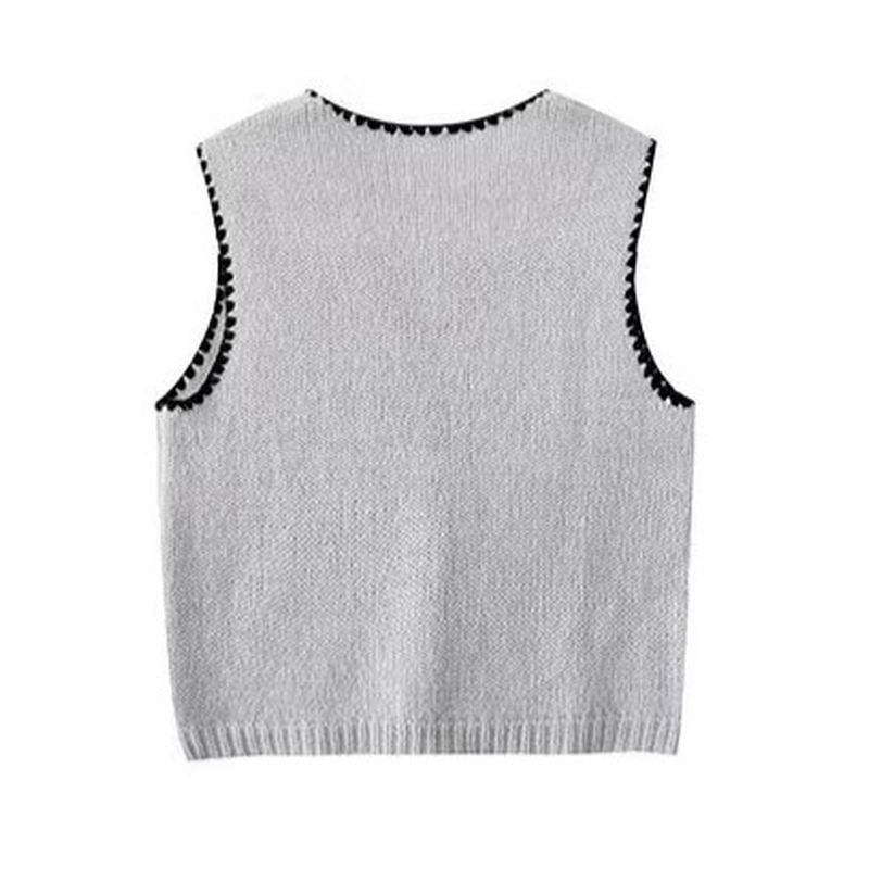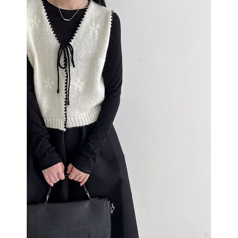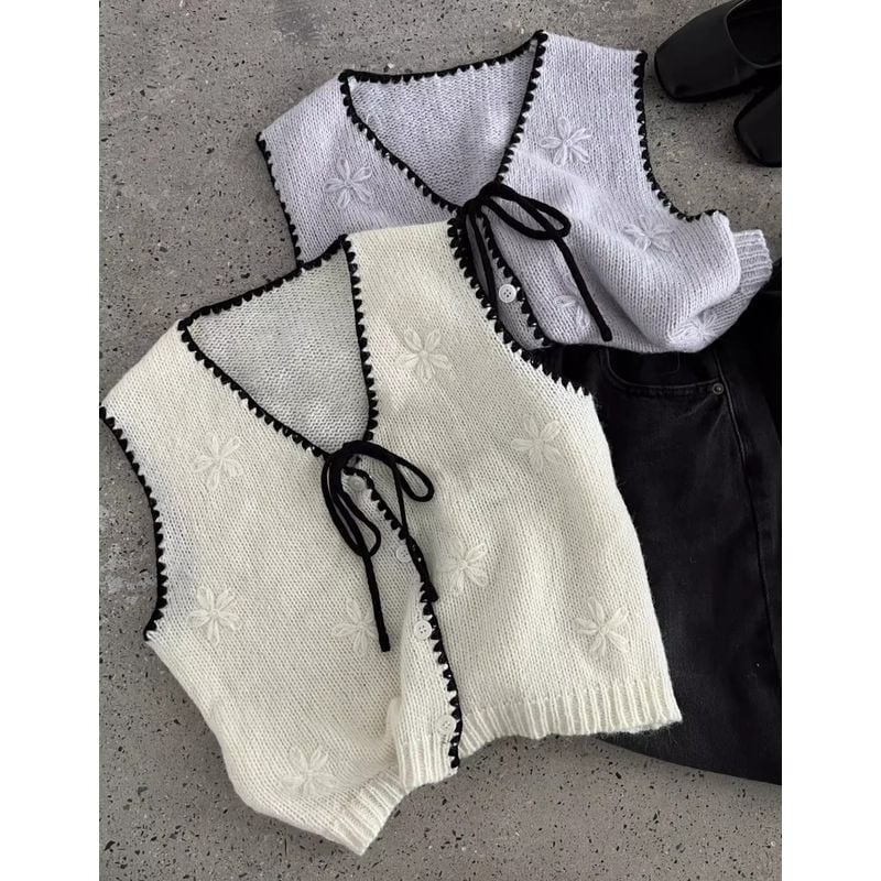 さりげなくあしらわれたフラワー刺繍が目を引くニットベスト。