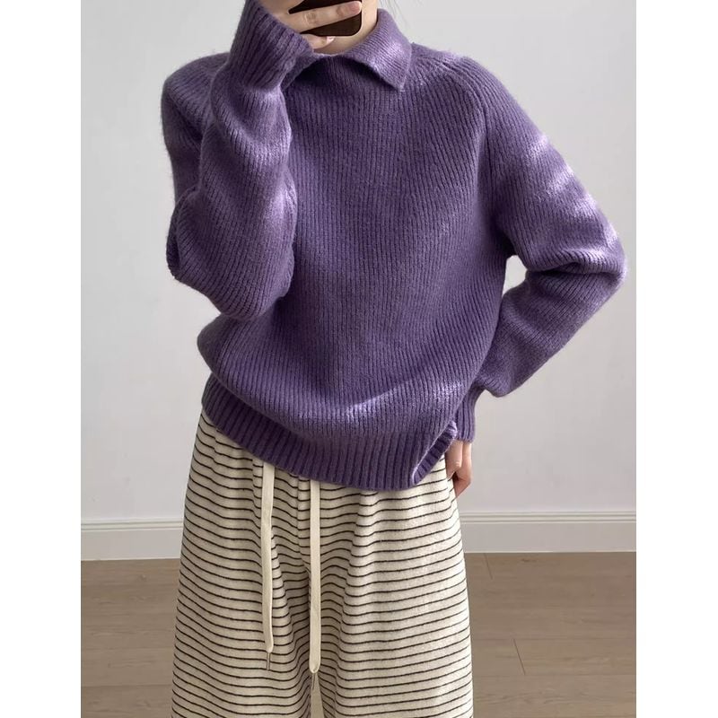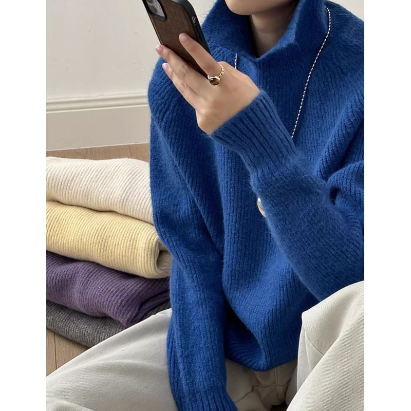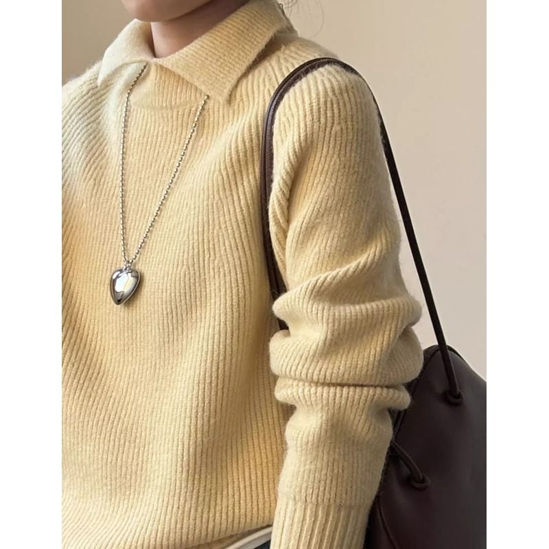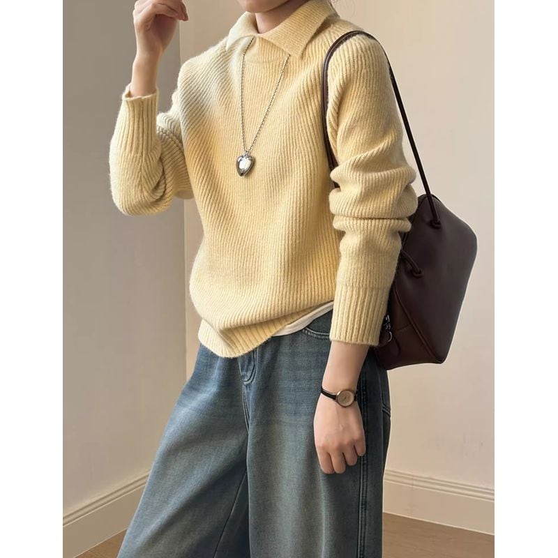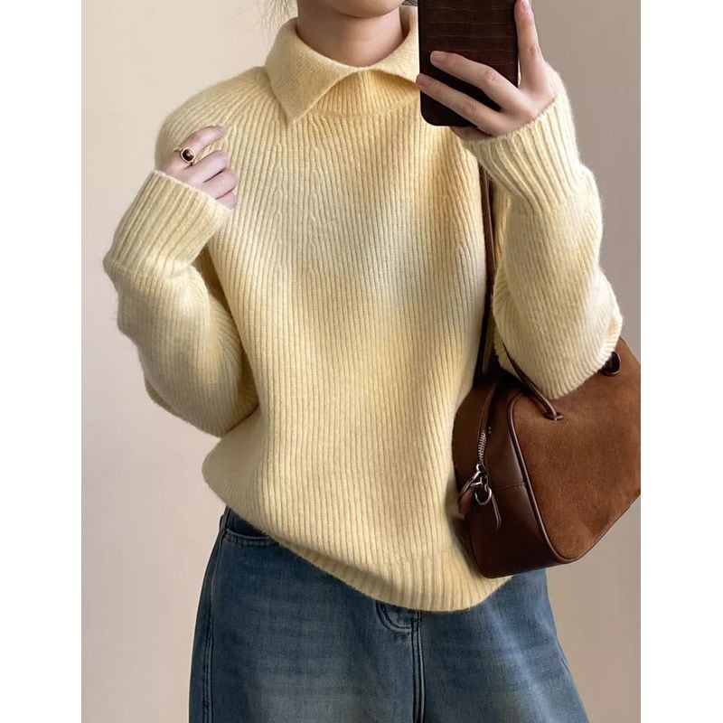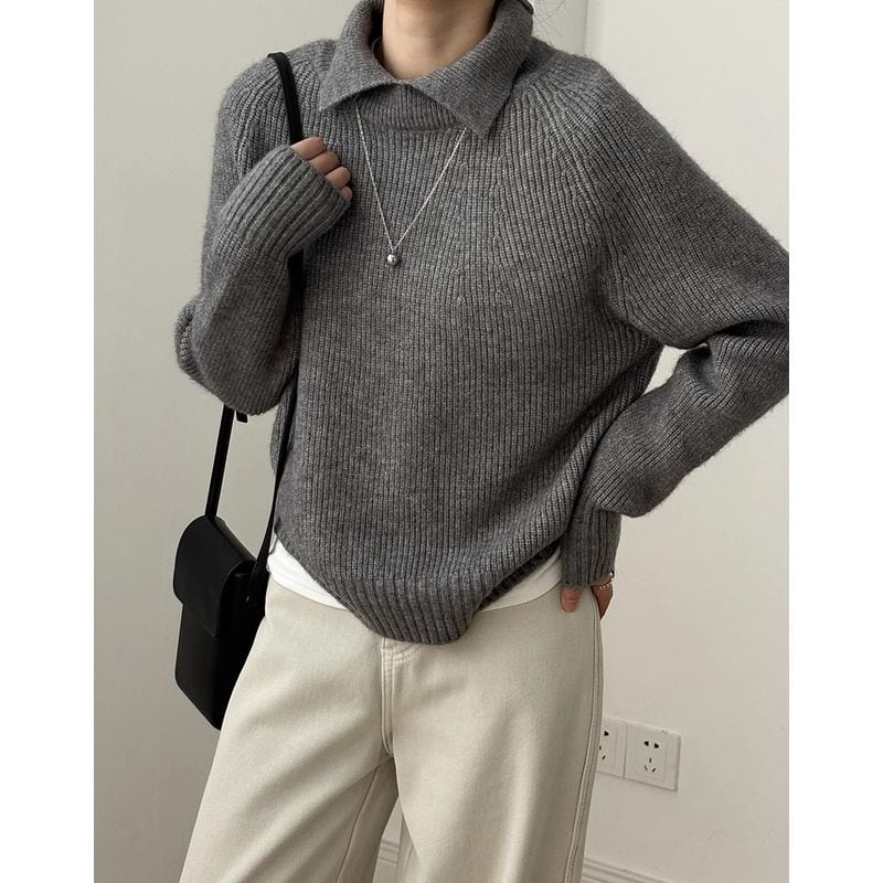 リブ編みと襟のデザインが上品で、大人の女性にぴったりのニット。