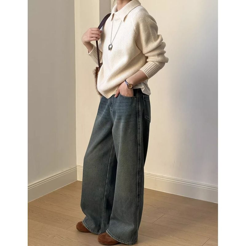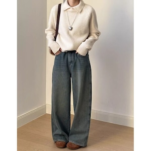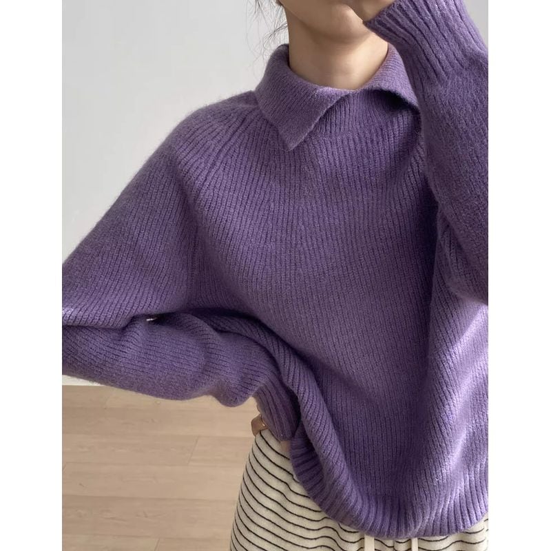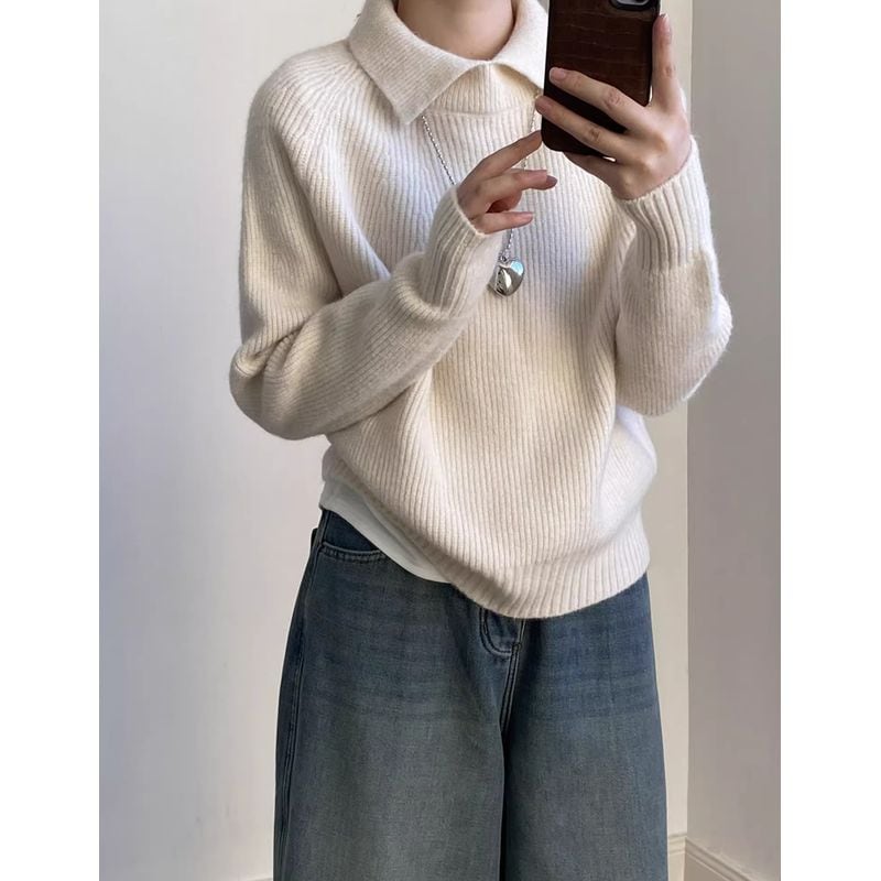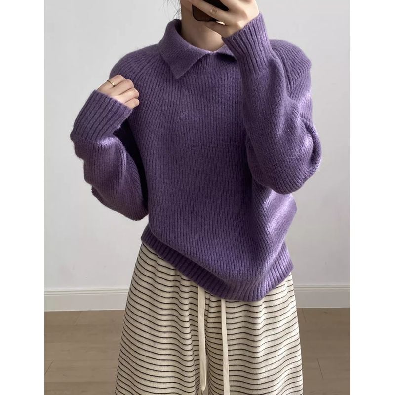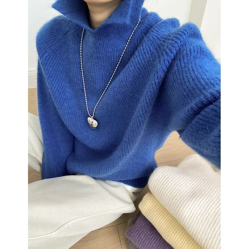 リブ編みと襟のデザインが上品で、大人の女性にぴったりのニット。