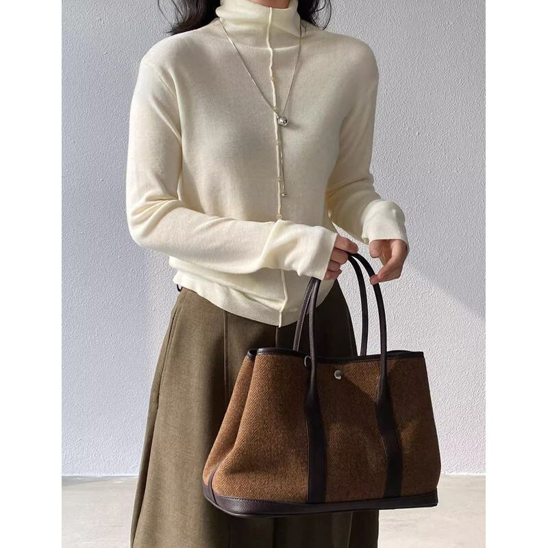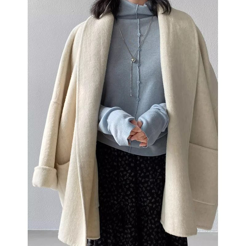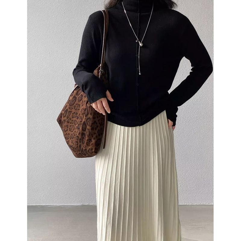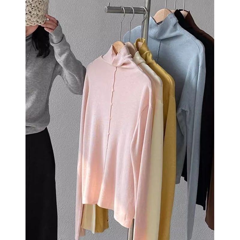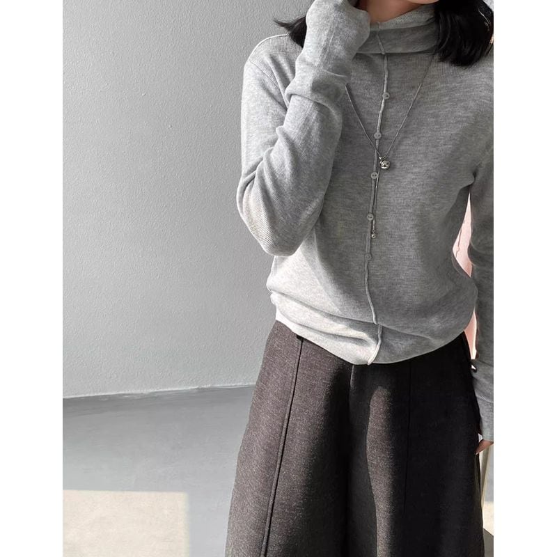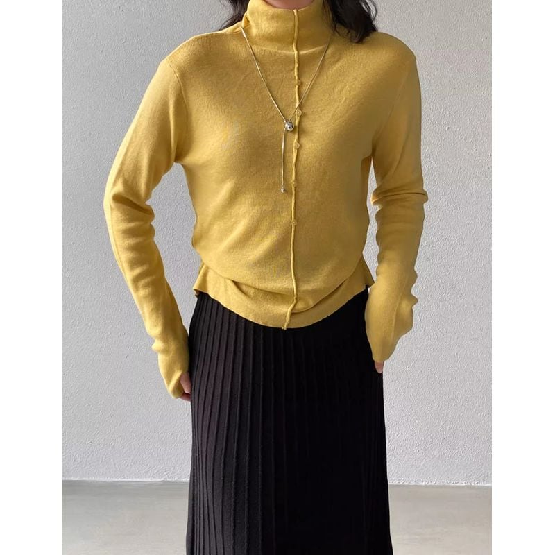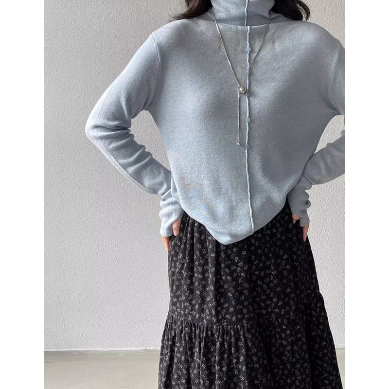シンプルなハイネックニットに、ボタンデザインがアクセントを添えた一着。