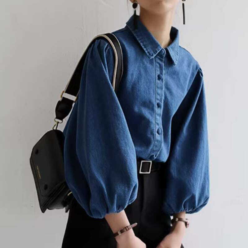 ▶くるみボタンボリュームスリーブデニムシャツ 201624