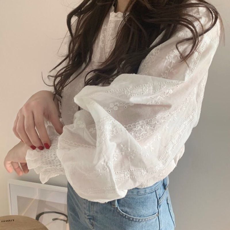 首元に繊細なレース刺繍、袖口にはフリルが施されたフェミニンなブラウス。
