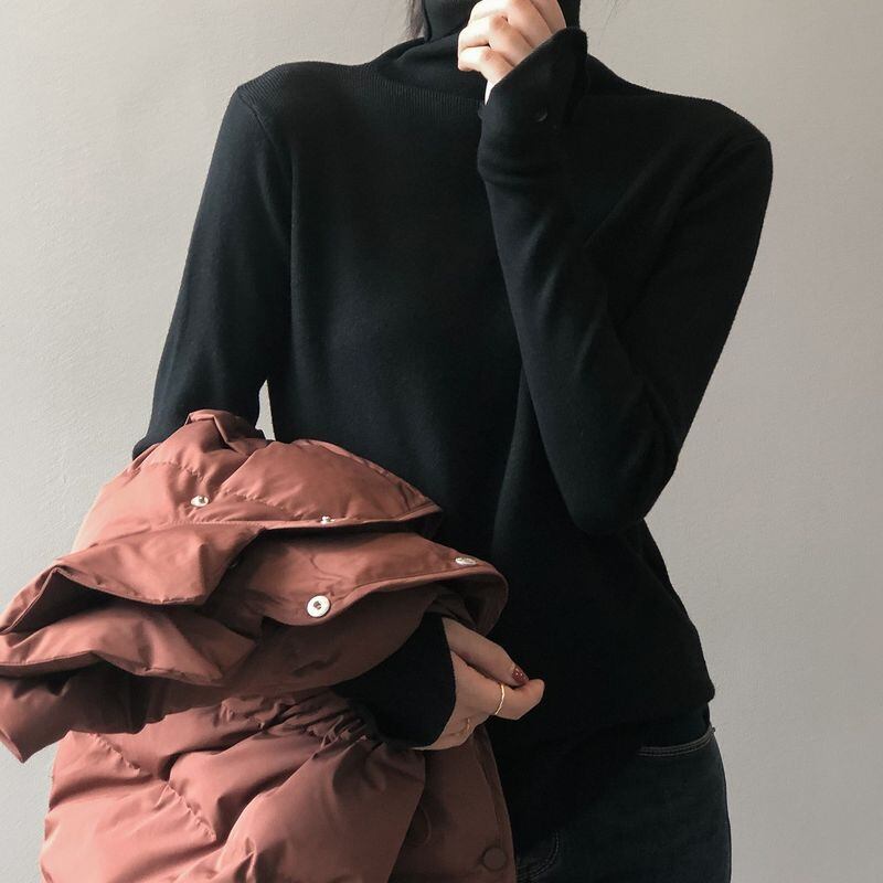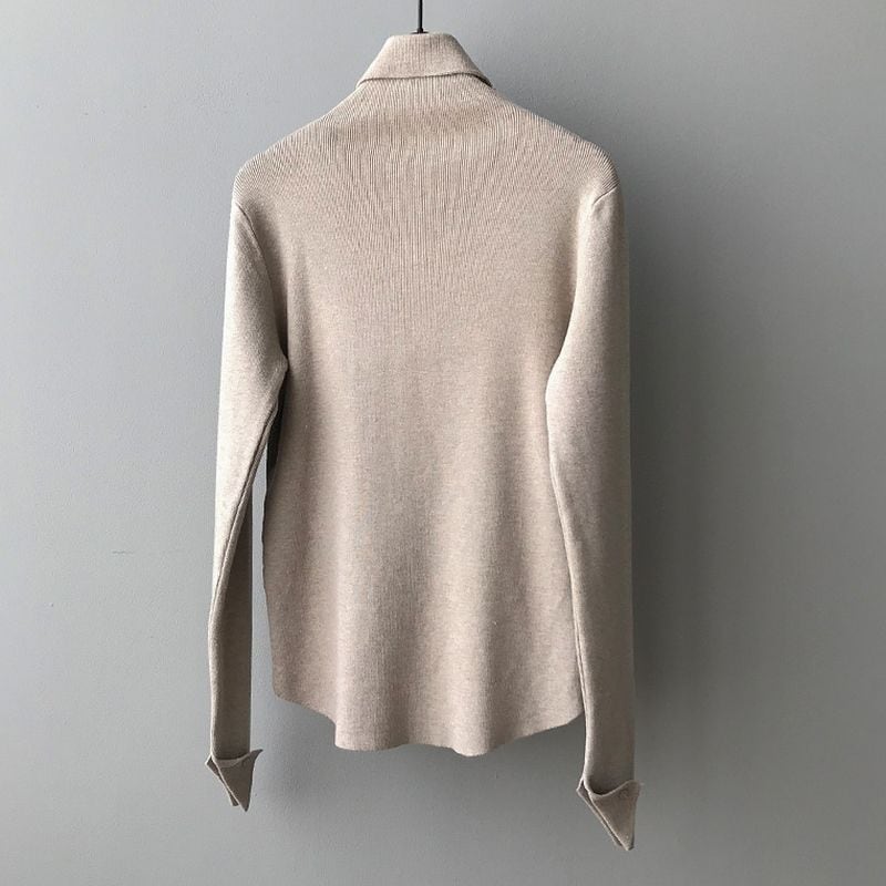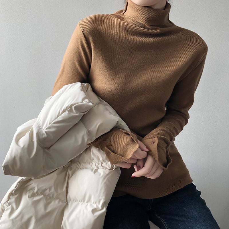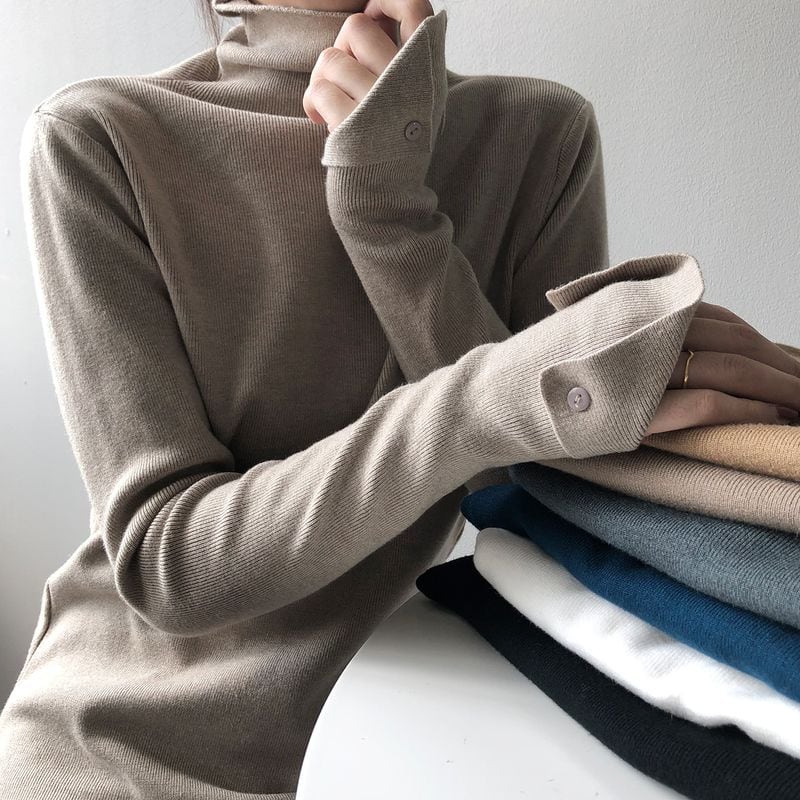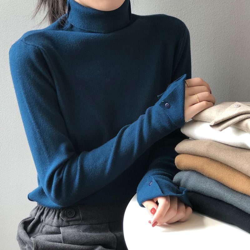 長めの袖口をボタンで折り込んだデザインが特徴のハイネックニット。