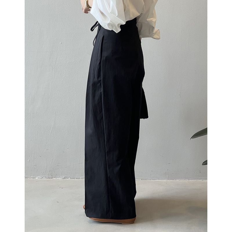 マニッシュな雰囲気を持ちながら、サイドのリボンベルトが大人可愛いアクセントになったワイドパンツ。