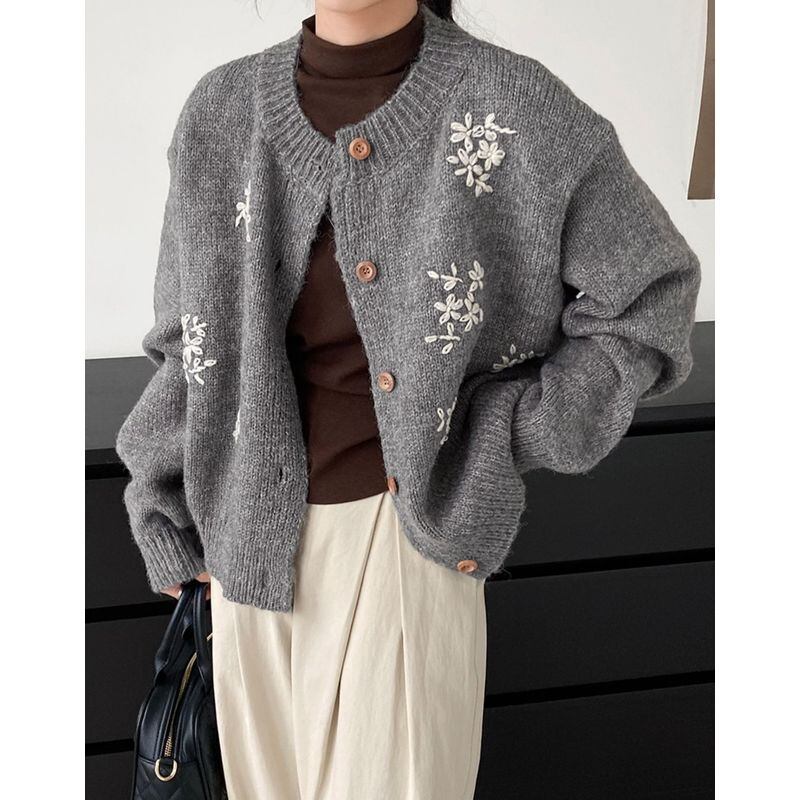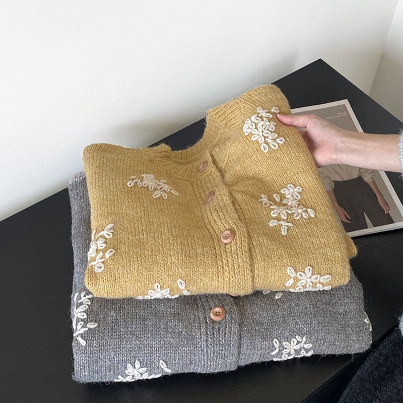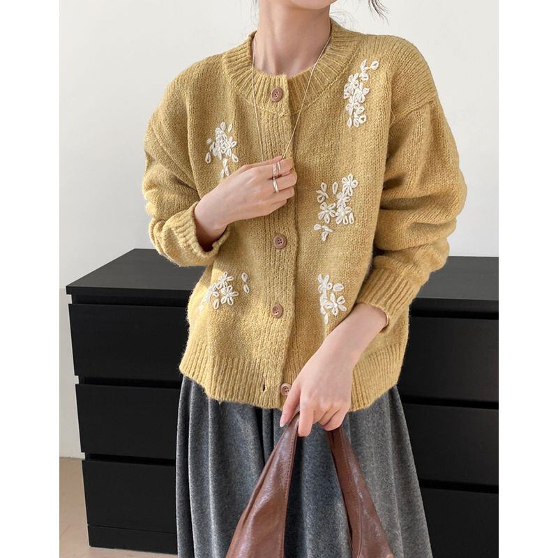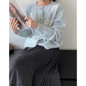 ラウンドネックフラワー刺繍ニットカーディガン 201730